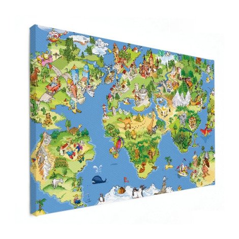Deze kinder wereldkaart is leuk om naar te kijken en bovendien educatief. Hoe langer je er naar kijkt, des te meer je ontdekt. Op de kaart staan namelijk dieren en gebouwen afgebeeld, waarom een land, regio of stad bekendheid geniet. Te denken valt onder andere aan het vrijheidsbeeld, de Eiffeltoren, de olifant en de kangaroe.
