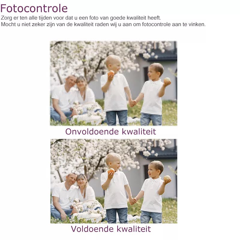 - Bij de extra opties in het bestelproces kunt u de optie fotocontrole aanvinken, onze professionals controleren dan uw foto op kwaliteit en passen deze indien het kan aan. Mocht er niets aan te doen zijn wordt er contact met u opgenomen en wordt er gezocht naar een oplossing.